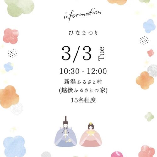 イベント 子育てサロン byこどもの居場所とごはん ひかりっこ 開催日:2026/3/3(火) イベント 新潟ふるさと村 de プリンセス気分 開催日:2026/3/7(土)~15(日) イベント 「#新潟のコメジルシ」フォトコンテスト2025 パネル展 開催日:2026年3月7日(土)~29日(日) 体験教室・チャレンジ ひねって作ろうバルーンアート体験(D・Ghost Works) 開催日:2026/3/7(土) 体験教室・チャレンジ オリジナル豆ノート・ミニノート作り 開催日:2026/3/7(土)・8(日) 体験教室・チャレンジ アロマテラピーワークショップ(aroma ku*ku) 開催日:2026/3/7(土)・8(日) 体験教室・チャレンジ シェイカー作り・リップ型ボールペン作り(Pёtal) 開催日:2026/3/8(日) 体験教室・チャレンジ 民話の昔がたり(黒埼とんと) 開催日:2026/3/8(日) 体験教室・チャレンジ ディンプルアート体験(Atelier ネムノキ) 開催日:2026/3/14(土) <<前へ 1 2 3 4 5 次へ>>