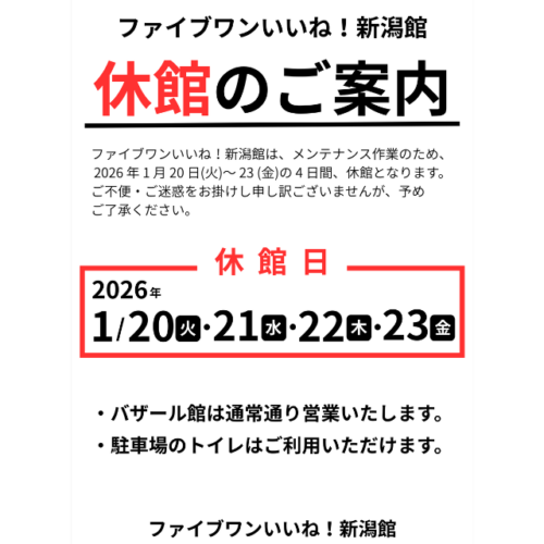 お知らせ 新潟ふるさと村 > お知らせ > 遊具メンテナンスのお知らせ 遊具メンテナンスのお知らせ 2024/07/18 安全点検のため、7/19(金)午前中、 グリーンハウスの木製遊具がご利用できません。 予めご了承下さい。